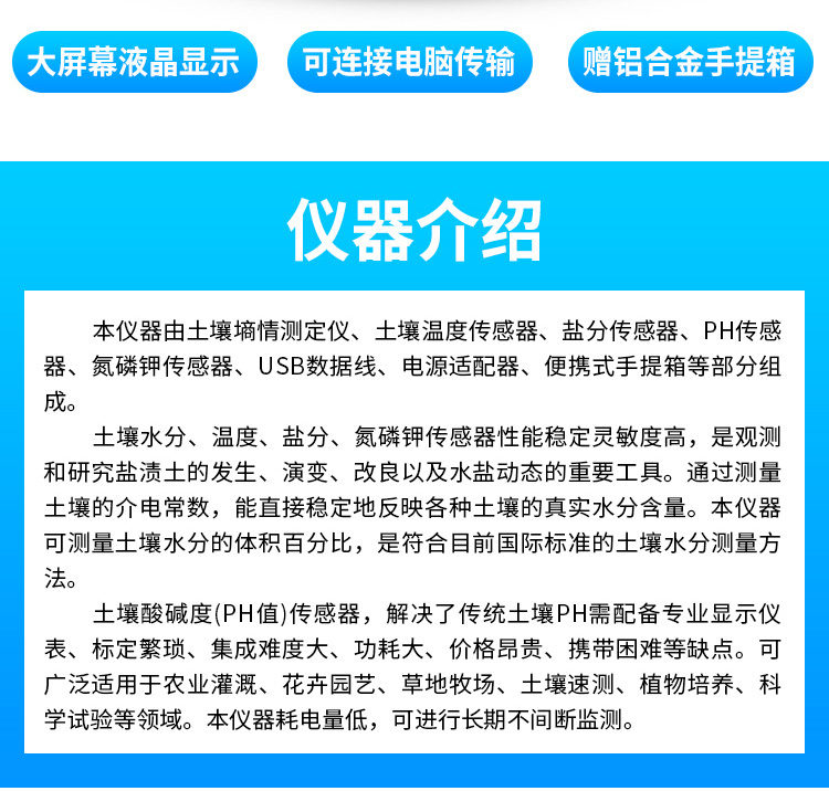 .廣泛應用于土壤酸堿度的檢測、旱作節(jié)水灌溉、精細農(nóng)業(yè)、林業(yè)、地質(zhì)勘探、植物培育、水利、環(huán)保等領(lǐng)域。