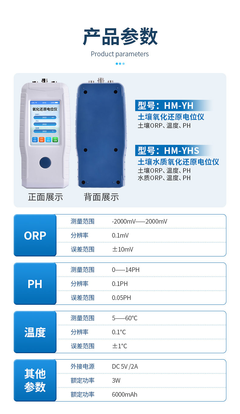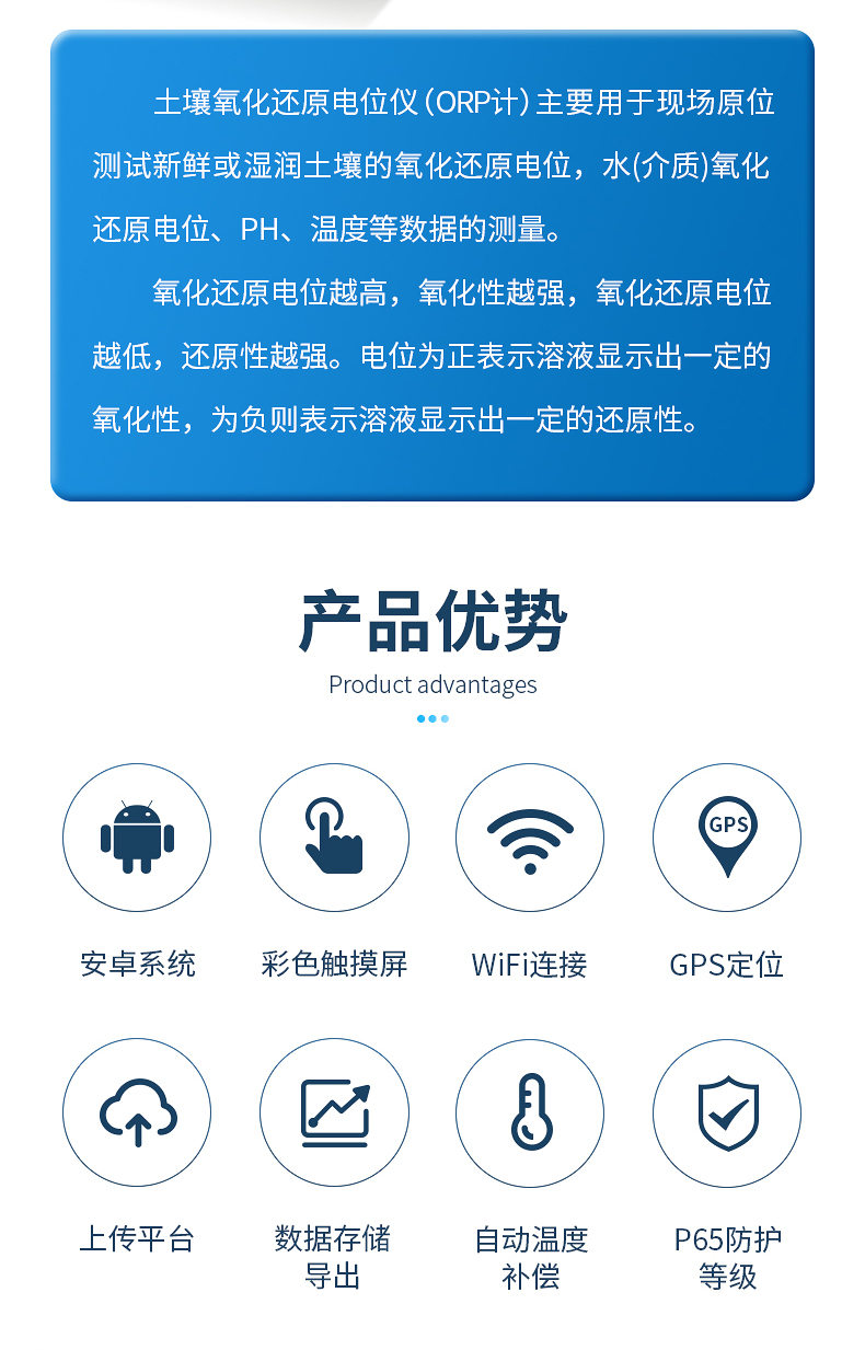 土壤水質(zhì)氧化還原電位儀(ORP計(jì))主要用于現(xiàn)場原位測試新鮮或濕潤土壤的氧化還原電位,水(介質(zhì))氧化還原電位、PH、溫度等數(shù)據(jù)的測量。符合《HJ746-2015土壤氧化還原電位的測定電位法》標(biāo)準(zhǔn)。